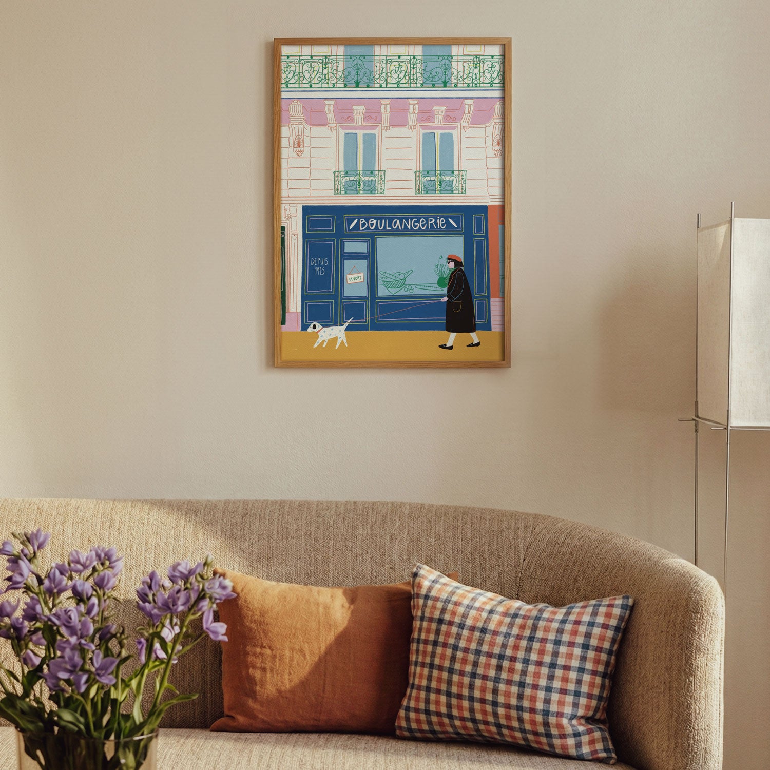 This illustration captures the simple ritual of fresh bread, slow walks, and everyday charm.