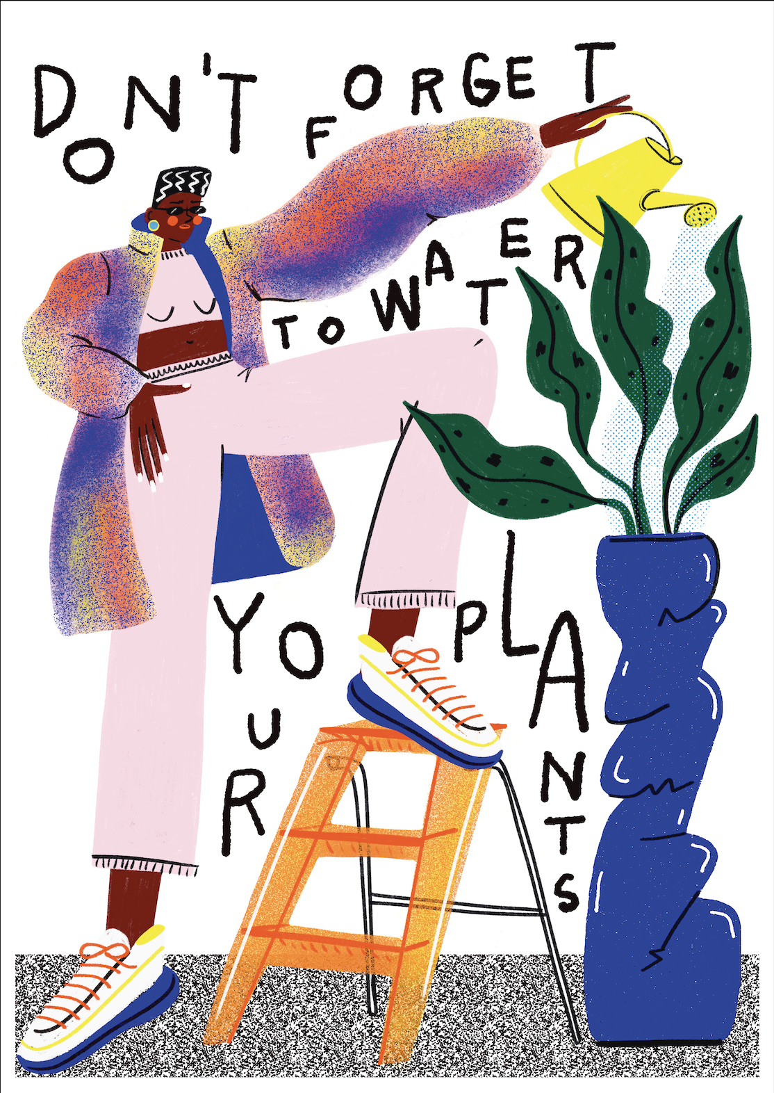 A playful reminder for plant lovers everywhere. Bold colors, big attitude, and a character who definitely knows how to keep her green friends alive. This print brings a spark of humor and style to any corner of your home.